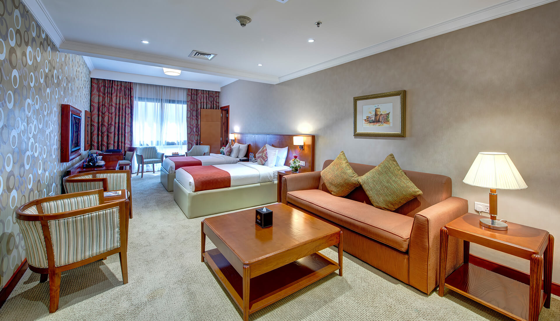 Our Executive Family Suites are the perfect choice for families. This spacious suite is equipped with 2 king-sized beds, 2 TV sets, dining area, well designed bathroom with amenities and a separate washroom for guest use. Larger families can also choose the option to combine with a connecting Deluxe Triple Room.